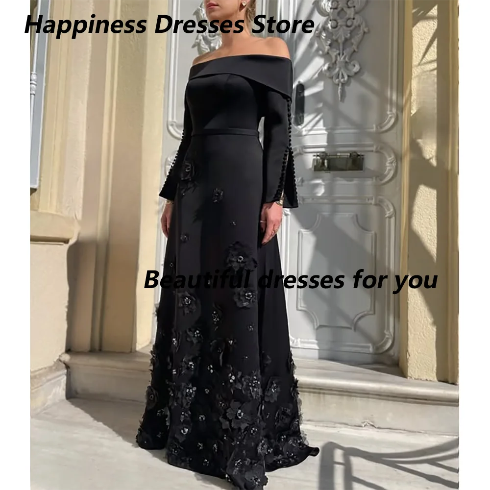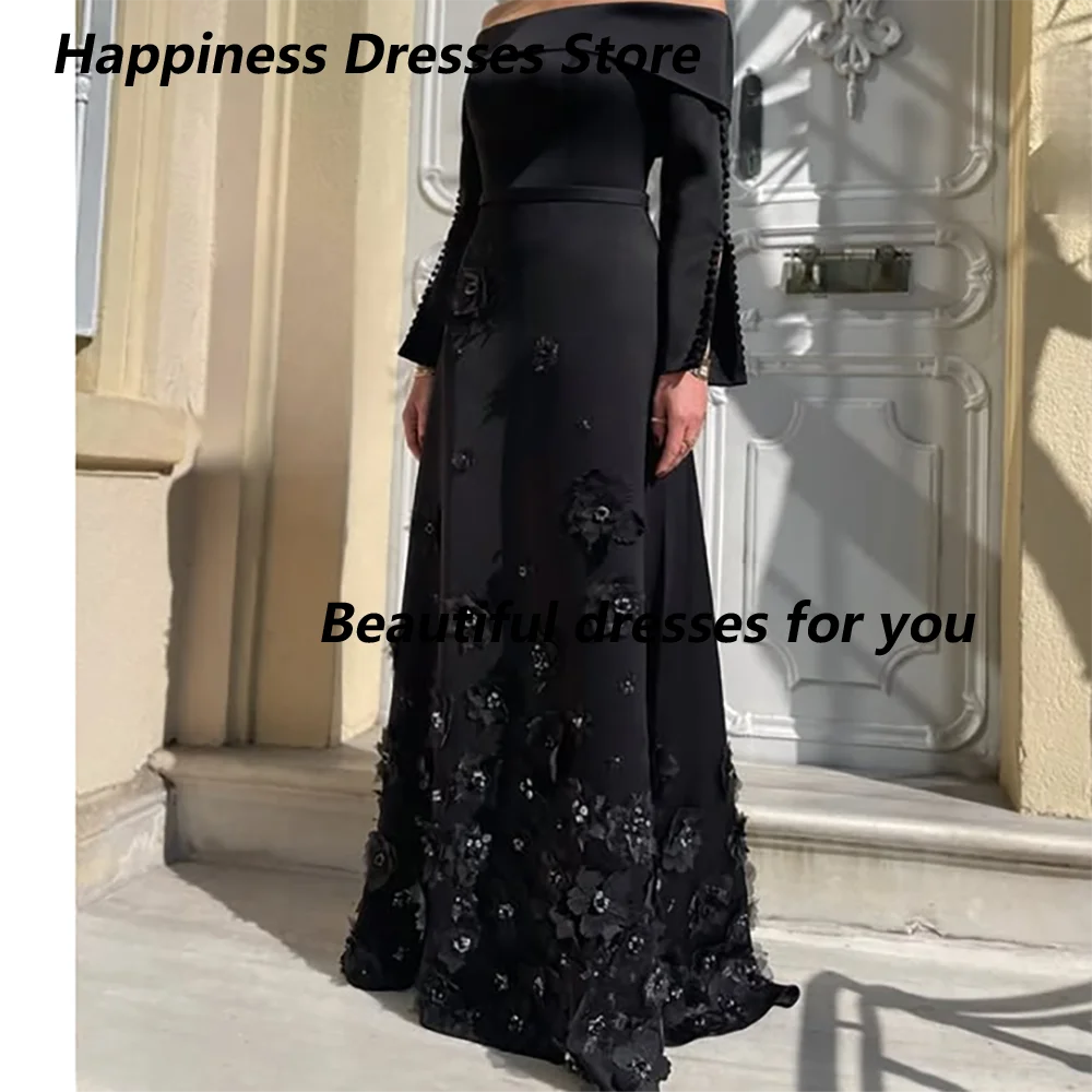 Black Evening Dress Customized Off Shoulder Long Sleeves Applique Floor Length A Line Prom Gown Jersey Saudi Arab Party Dress