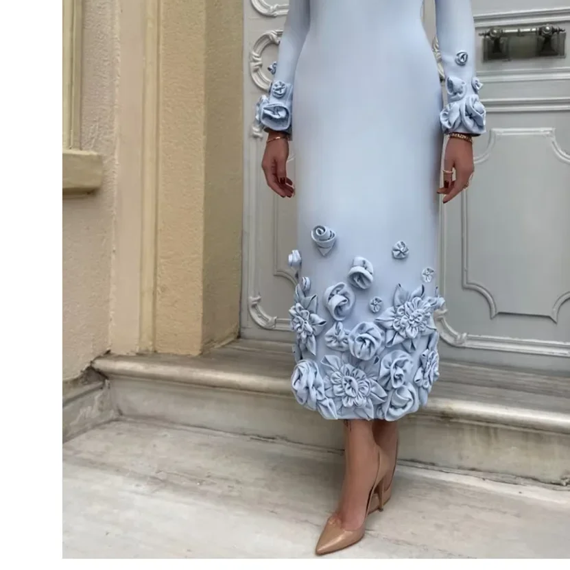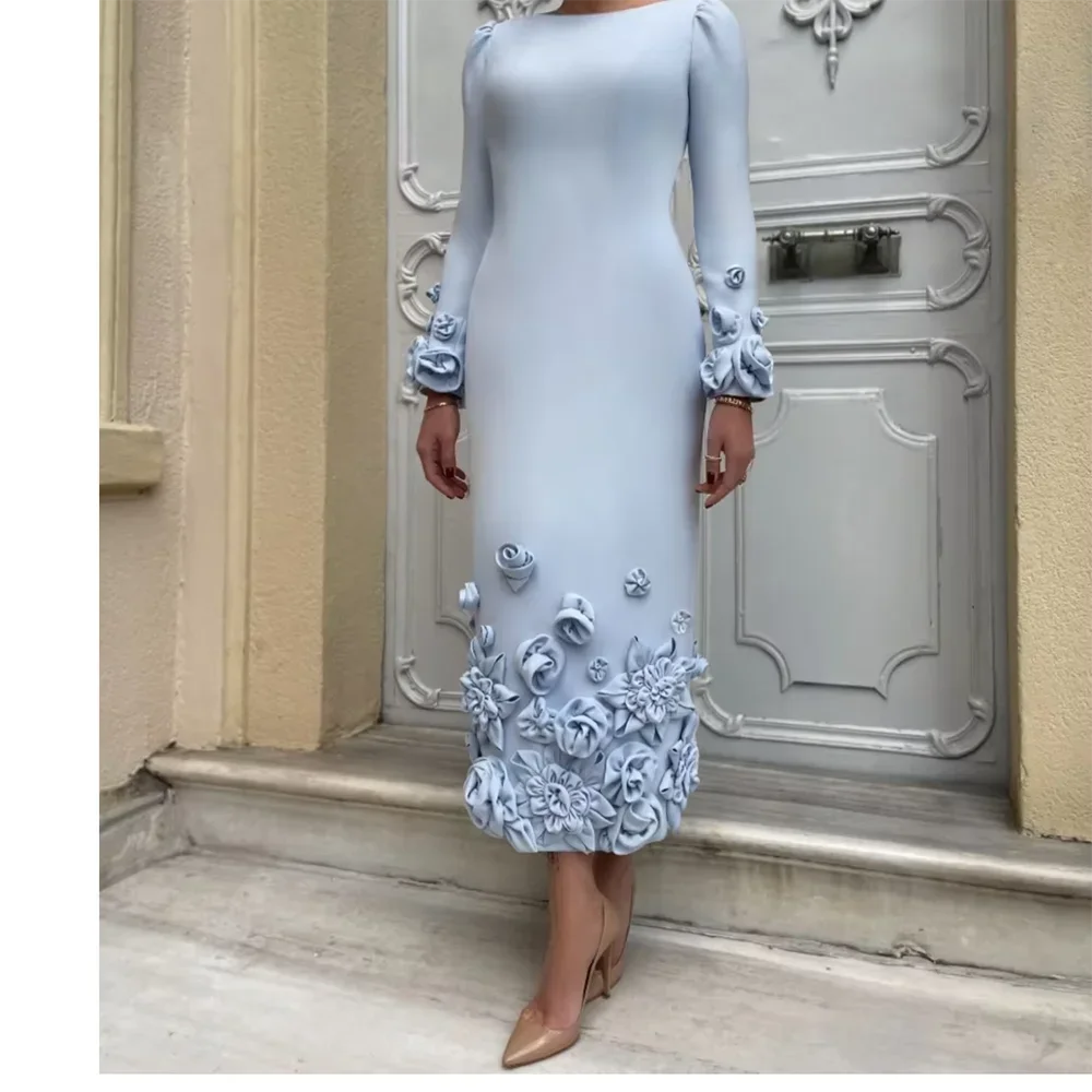 Customized Long Sleeves Evening Dresses Pleat Flower Straight O-Neck Midi Dresses Sizes Available Cocktail Dresses Unisex