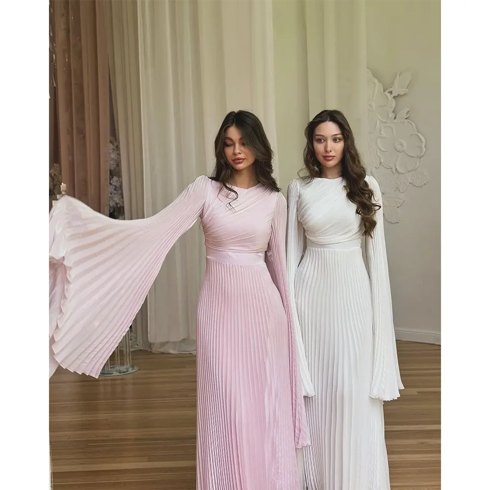 Customized O-Neck Pleated Floor Length Prom Dresses Pleated Long Sleeves Party Dresses Formal Occasion Evening Dresses